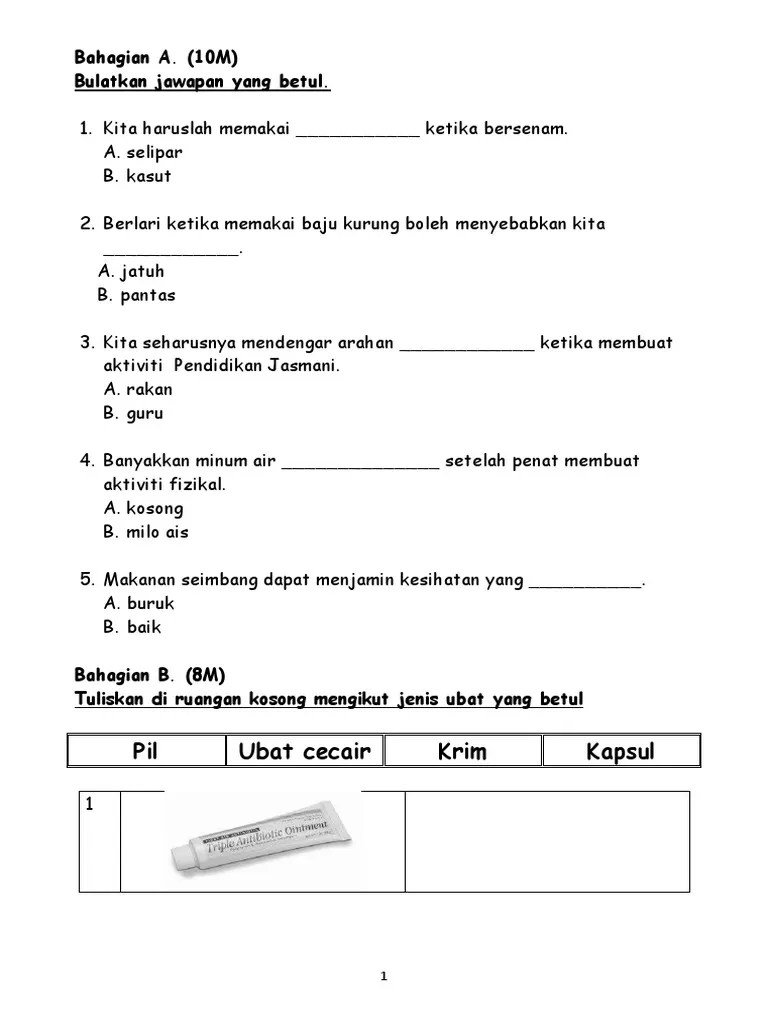 Koleksi ujian pertengahan penggal 2 pendidikan kesihatan tahun 1 kssr atau ujian bulan ogos tahun 1 untuk pelbagai mata pelajaran.